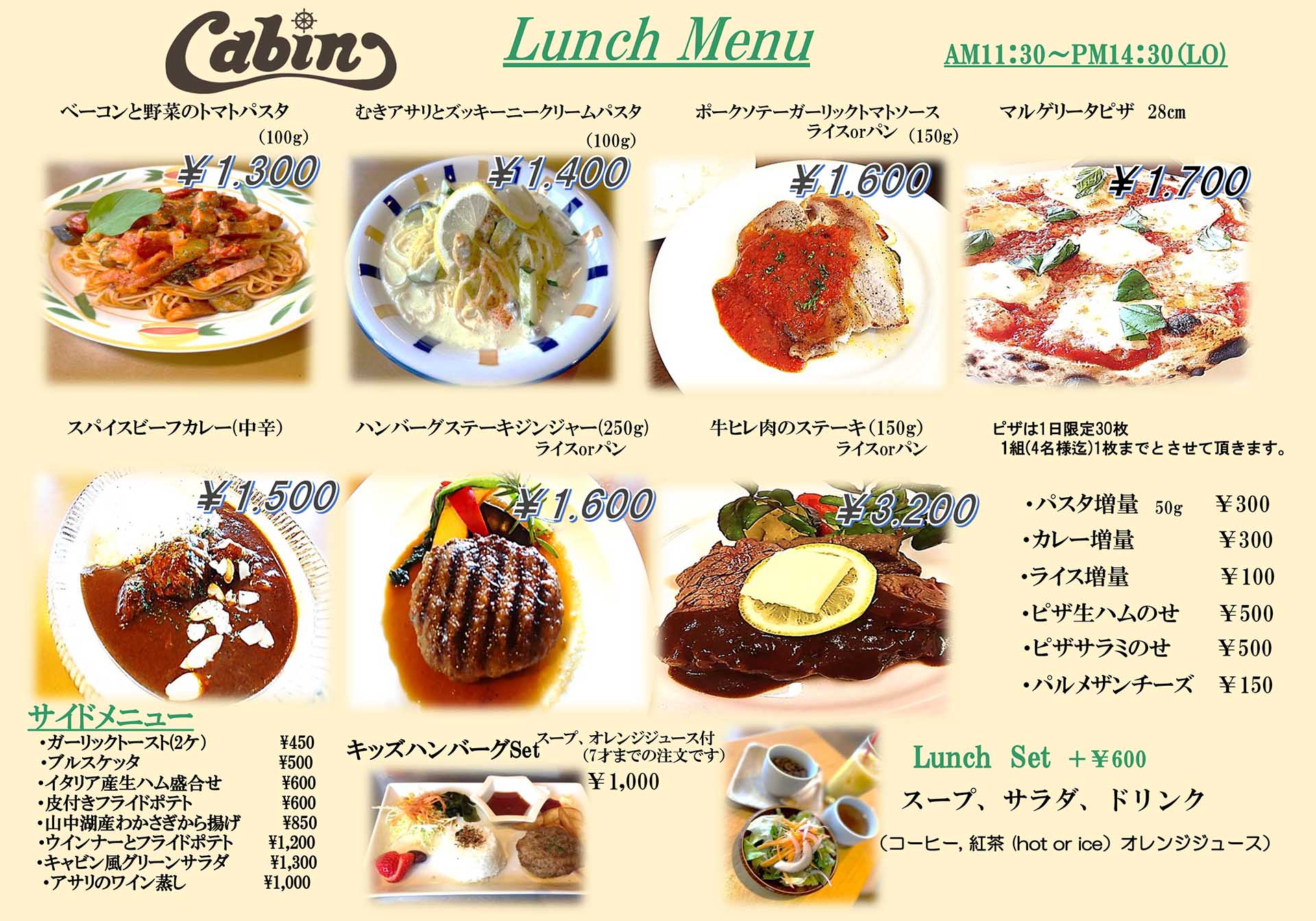 ランチタイム 11:30~15:00(L.O.14:30) おすすめメニュー パスタランチ 1,300円~ 当店自慢のパスタをランチにいかがでしょう。+600円でスープ、サラダ、ドリンクが付いた>お得なセットになります。 他にも様々なランチメニューをご用意しております。(季節により内容変更いたします。) ランチデザート